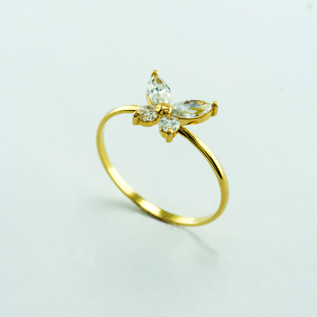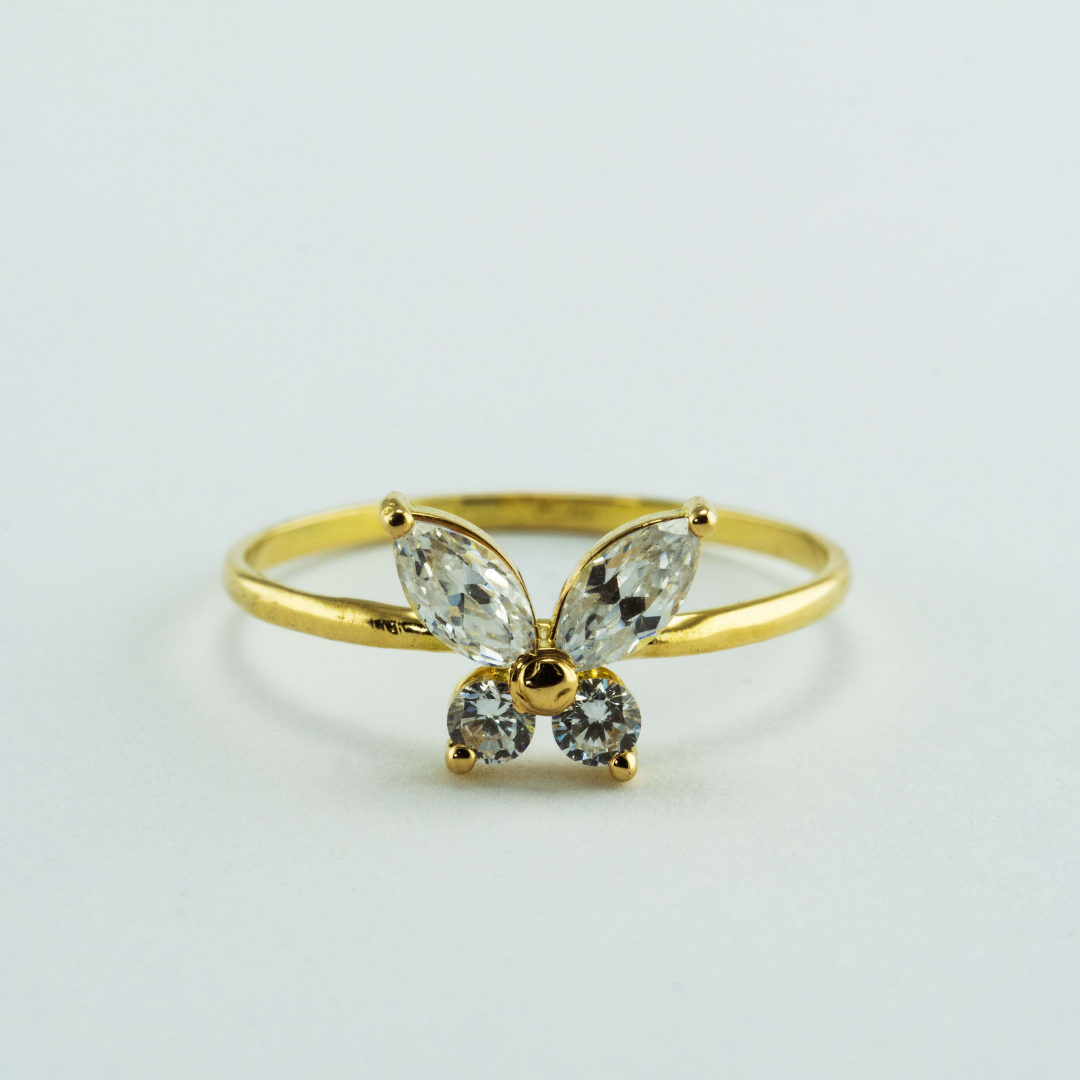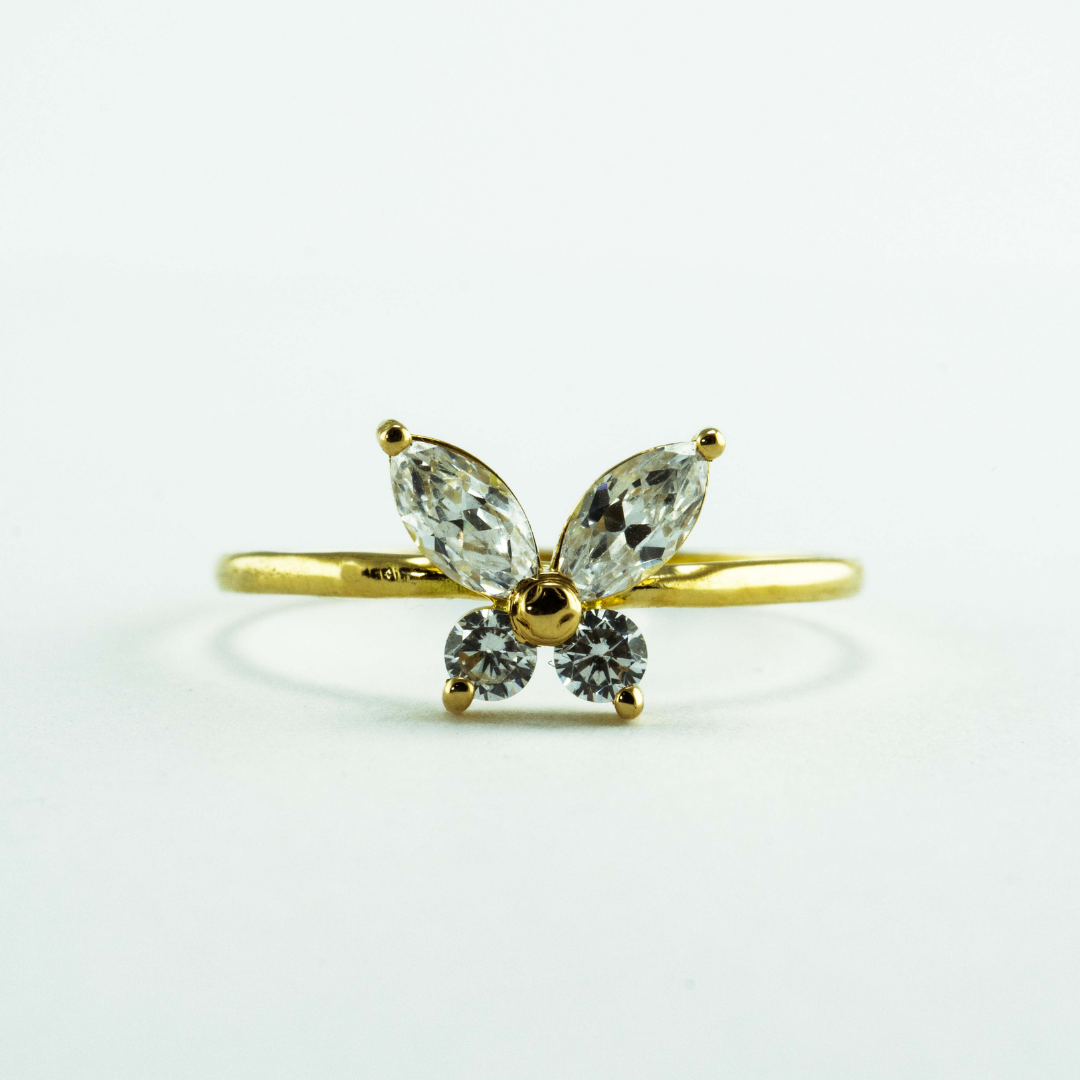 Anillo Mariposa Libre, oro amarillo de 18k, engastada con 2 moissanites corte Marquise de 0.40 quilates (5 x 2.5mm) y 2 Moissanites corte brillante de 0.12 quilates (2mm diametro)